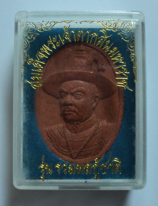 เนื้อดิน สมเด็จพระเจ้าตากสินมหาราช รุ่นรวมพลกู้ชาติ หลังอนุสาวรีย์สมเด็จพระเจ้าตากสินมหาราชพร้อมสี่ทหารเอก ปีพ.ศ.2553 ณ ค่ายตากสินมหาราช จันทบุรี ปลุกเสก 3 วาระ ขนาดสูง 4 ซม. โดยประมาณ